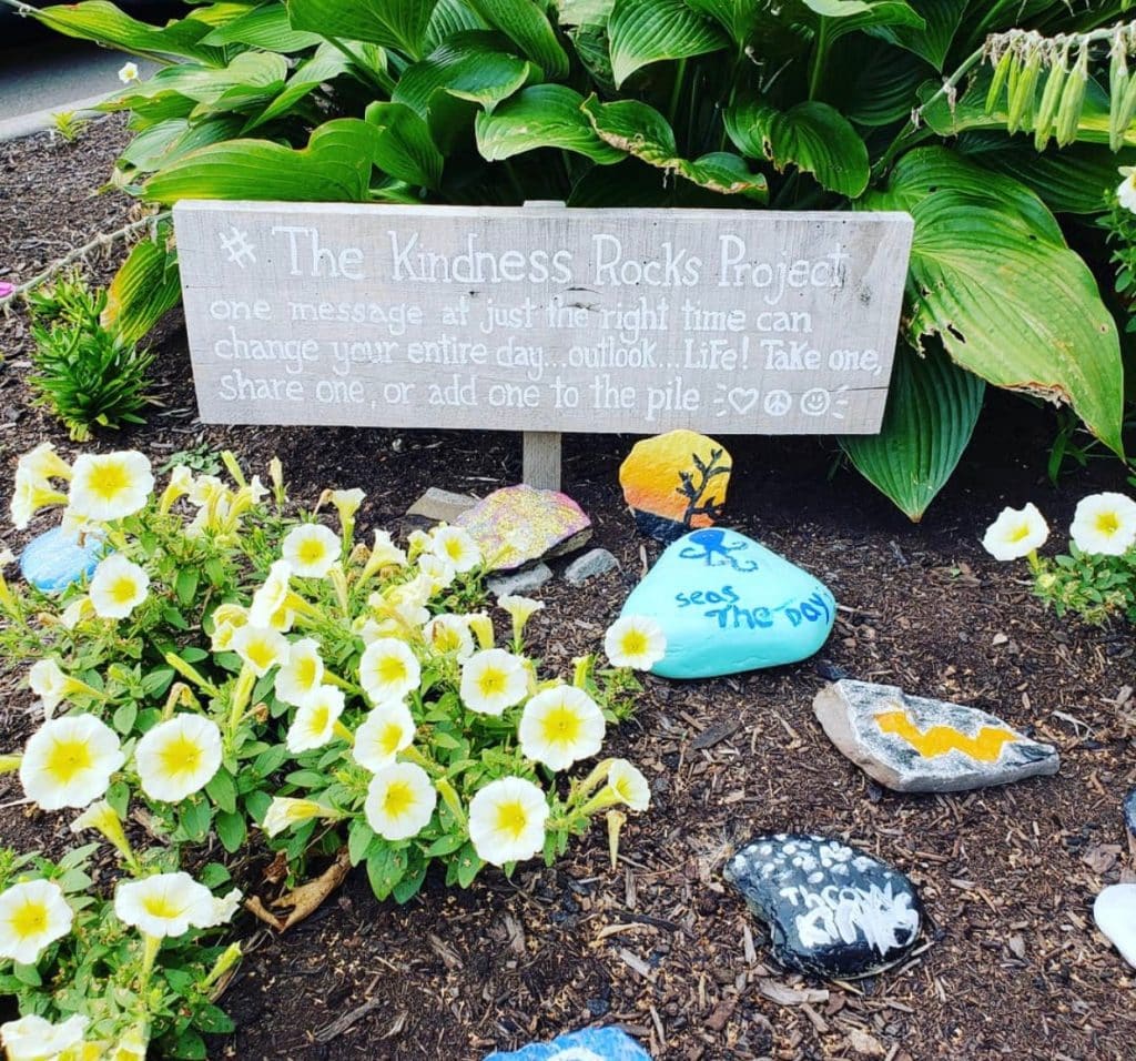 A few years back the Wilson high school and middle school health classes led by the Health teacher (and field hockey & track & field coach) started a kindness rock project. Students painted rocks with positive sayings. The rocks are placed at the elementary school, middle school, and high school for all to enjoy. The Field Hockey team created many more rocks and gave the elementary school project area a “kindness facelift”.