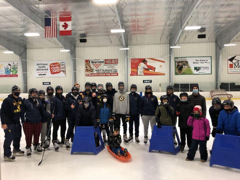 My team also works with a mentor program with a 2nd grade class every year.  We team up with these students about every other week and work with them.  We also skated with the Rochester Ice Cats (special needs hockey program).  This was a 2 hour event where our team of 24 worked with young kids and adults to skate and play hockey.  We also do volunteer youth clinics for students in grades K-6.  We did one of these over break.  I also had our seniors work with veterans on a Sunday in December to learn how to ice skate 🙂