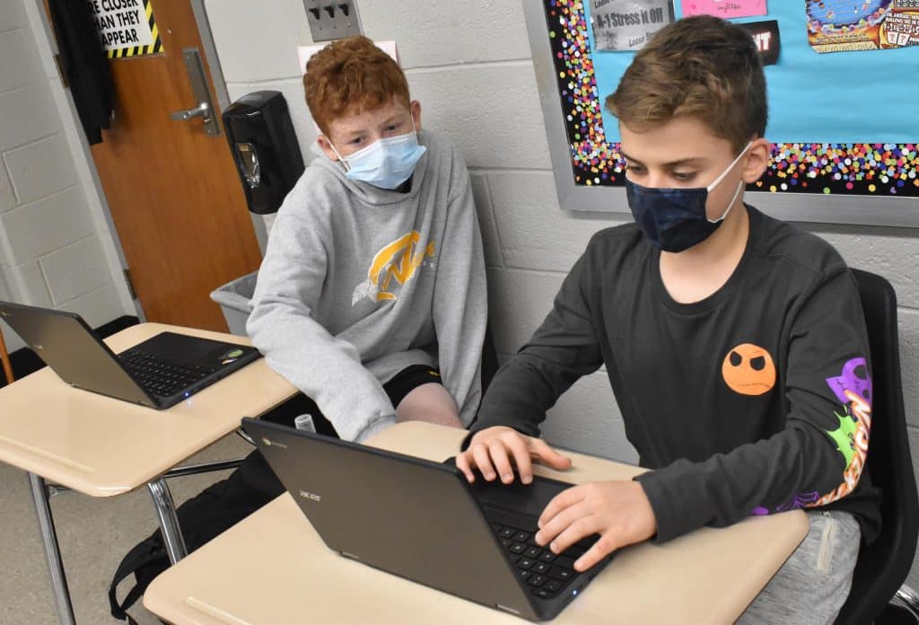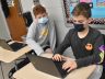 2: Seventh graders Olivia Haines, left, and Ava Barberio did research about funding for pediatric cancer research as they prepared to write a letter together urging an increase.
