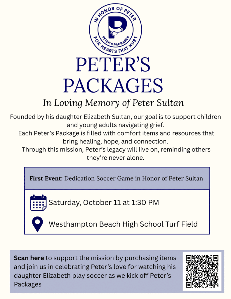 My name is Elizabeth Sultan, the founder of Peter’s Packages, and the daughter of Peter Sultan, who passed away suddenly this July. Losing my dad so early in life and knowing I would miss him longer than I had known him was something I never expected or was ready to face. However, I am learning and growing every day with the grief that I will forever carry with me. One way I have adjusted to this new life is by finding a way to honor my dad. My dad’s death was very tragic and sudden, which also means that he wasn’t hurting leading up to it. I had no preparation, yet he had no pain, which is why I am the one left hurting. When taking this into consideration, in his memory, I am starting an organization to support children and young adults who are also navigating grief. Peter’s Packages will deliver care packages filled with items and resources that brought me comfort and healing during this time. Through Peter’s Packages, my dad’s legacy will live on in a way that brings comfort, hope, and healing to others who had to sit front row at their first funeral and are facing the challenges of grief. I started fundraising and generating awareness this fall through the Westhampton Beach Girls Varsity Soccer Team, most prominently a game dedicated to my Dad, and spreading the mission of Peter’s Packages.