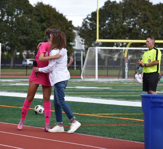 I started fundraising and generating awareness this fall through the Westhampton Beach Girls Varsity Soccer Team, most prominently, a game dedicated to my dad. At the game, the team wore headbands with the Peter’s Packages logo, and I spoke at the beginning and at halftime about my initiative. Peter’s Packages also ran a booth that sold branded t-shirts and cookies. I shared a flyer that launched the QR code for the Amazon Wishlist, where individuals are encouraged to shop for comforting items that will be meaningfully organized in packages and distributed to those grieving. Representatives from Peconic Bay Medical Center (where my dad worked) came to support the game and presented me with a check.