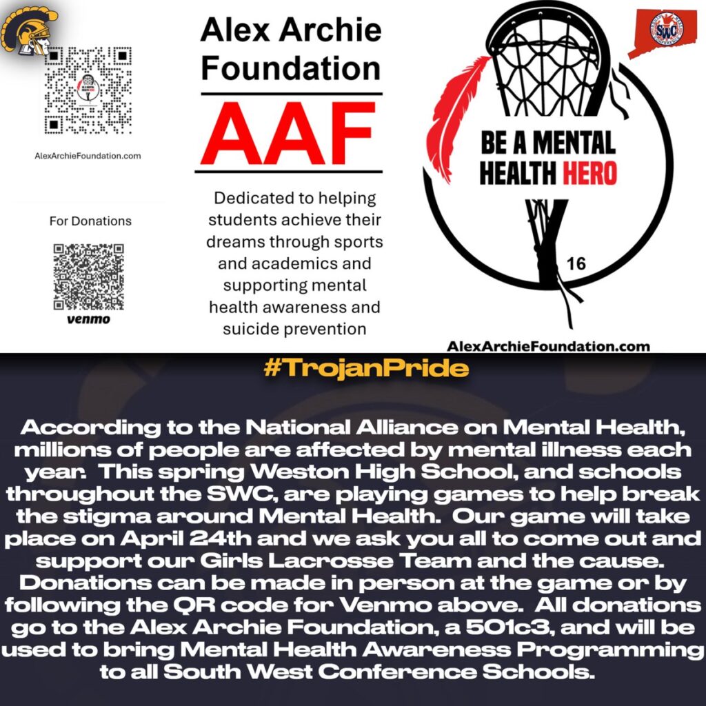 The Weston Boys Lacrosse team recently hosted an awareness game against Joel Barlow High School, combining competition with purpose. The event focused on bringing attention to mental health challenges while also raising funds for the Alex Archie Foundation.