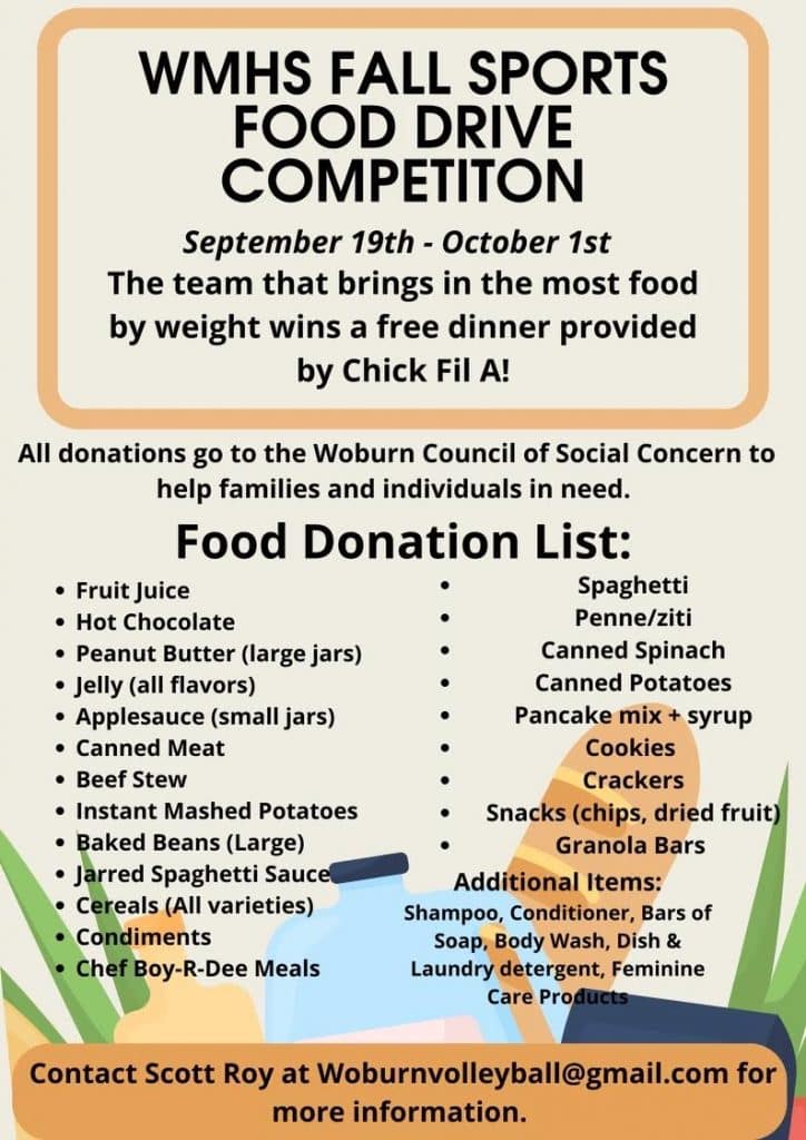 We ran the same program last year and raised over 600 pounds of food. This year we hope to get the football team involved and compete in groups for the greatest total weight. We run the drive for about 10 days and bring all the food/supplies to the Woburn House of Social Concern for donation and weight. All 3 of our volleyball teams participate- 38 players total.