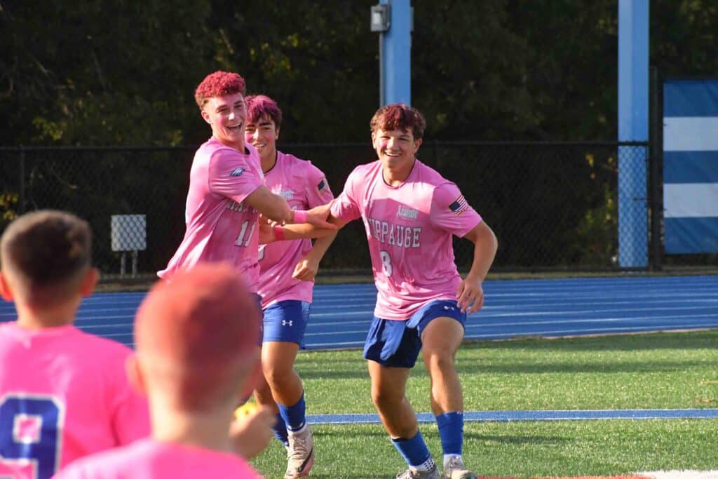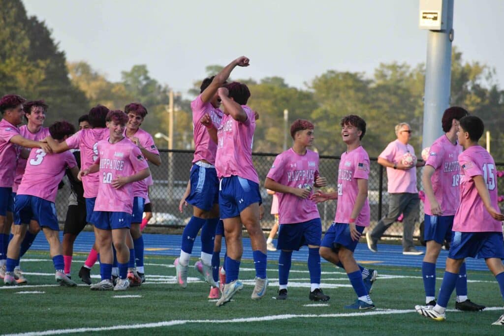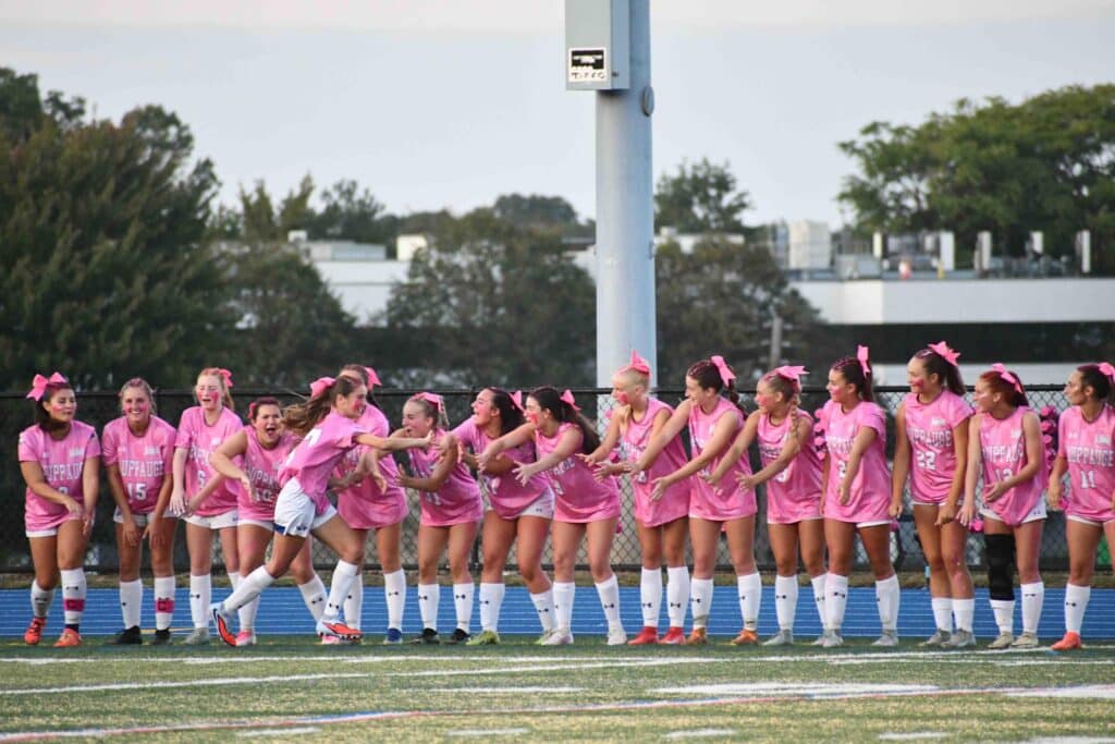 Beneath the glow of the Robert Druckenmiller Field lights, the crowd erupted with cheers as the boys and girls soccer teams took the field, sporting pink uniforms in honor of the cause. The boys team faced off against Eastport-South Manor Junior-Senior High School, earning a dominant 9-0 victory. The girls team competed against Comsewogue High School, playing a hard-fought game that ended in a narrow 0-1 loss. Between games, the energy remained high thanks to performances by the Hauppauge kickline, color guard and pep band.