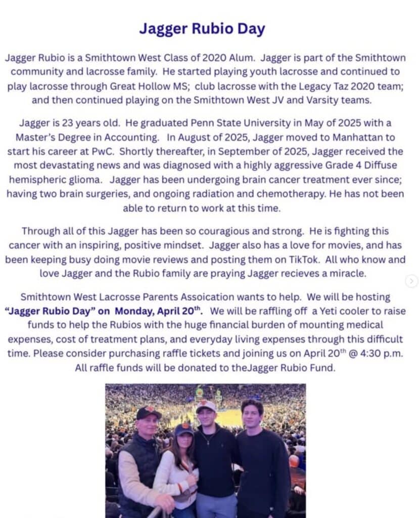 During today’s game, players, families, and fans are rallying behind Jagger Rubio, a Smithtown West Class of 2020 graduate and former lacrosse player who is courageously battling a Grade 4 diffuse hemispheric glioma, a rare and aggressive form of brain cancer.