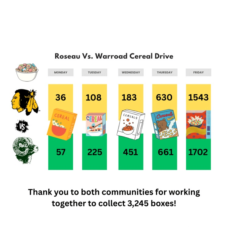 In just one week, the two schools collected an incredible 3,245 boxes of cereal to help local families in need. Warroad contributed 1,543 boxes, while Roseau narrowly edged them out with 1,702 — earning Warroad the honor of wearing green the following Friday!